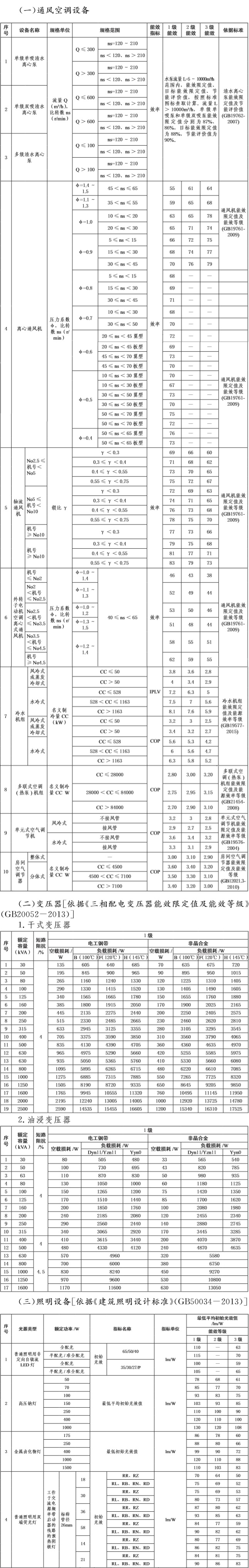 按照《能源效率标識管理辦法》(國家發展改革委、國家質檢總局2016年第35号令)要求,由國家發展改革委會同國家質檢總局、國家認監委規定統一适用的産品能效标準、實施規則、能效标識樣式和規格。本部分結合《清水離心泵能效限定值及節能評價值》(GB19762-2007)、《通風機能效限定值及能效等級》(GB19761-2009)、《冷水機組能效限定值及能源效率等級》(GB19577-2015)、《多聯式空調(熱泵)機組能效限定值及能源效率等級》(GB21454-2008)、《單元式空氣調節機能效限定值及能源效率等級》(GB19576-2004)、《房間空氣調節器能效限定值及能效等級》(GB12021.3-2010)等标準規定,給出瞭通風空調設備的能效等級劃分依據;結合《三相配電變壓器能效限定值及能效等級》(GB20052-2013),給出瞭變壓器的能效等級劃分依據;結合《建築照明設計标準》(GB50034-2013),給出瞭照明燈具的能效等級劃分依據。